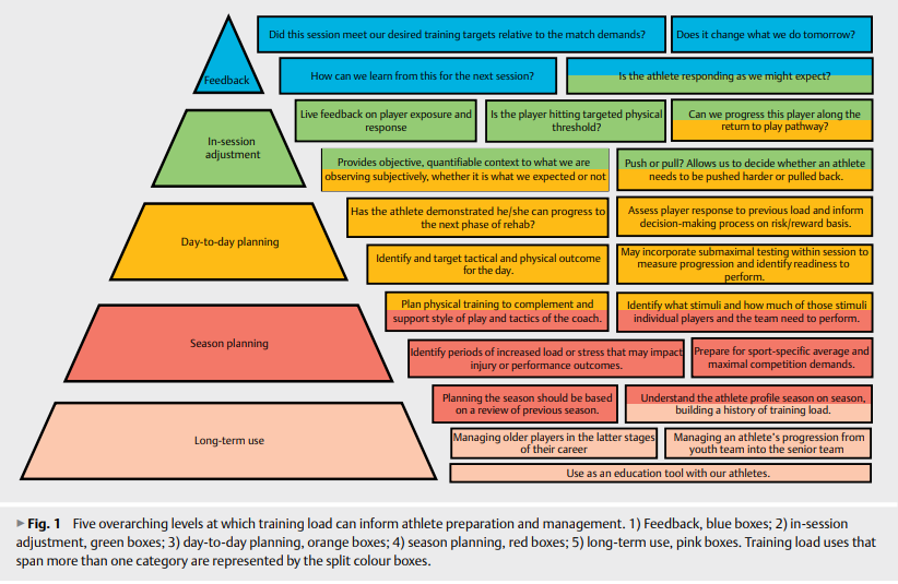 As detailed in the study by West et.al ( 2020) load management is premised on a comprehensive risk analysis and intervention framework. They go on to provide a helpful schematic of the 5 Overarching Levels at which Training Load can inform Athlete Preparation and Management shown here.